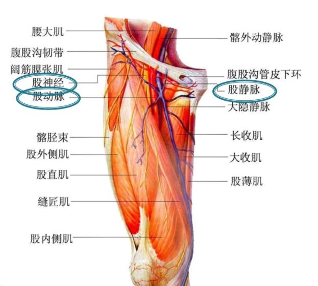 股静脉在股三角区,位于股鞘内,在腹股沟韧带下方紧靠股动脉内侧,如在髂前上棘和耻骨结节之间划一联线,股动脉走向和该线的中点相交,股静脉在股动脉的内侧约0.5cm处。