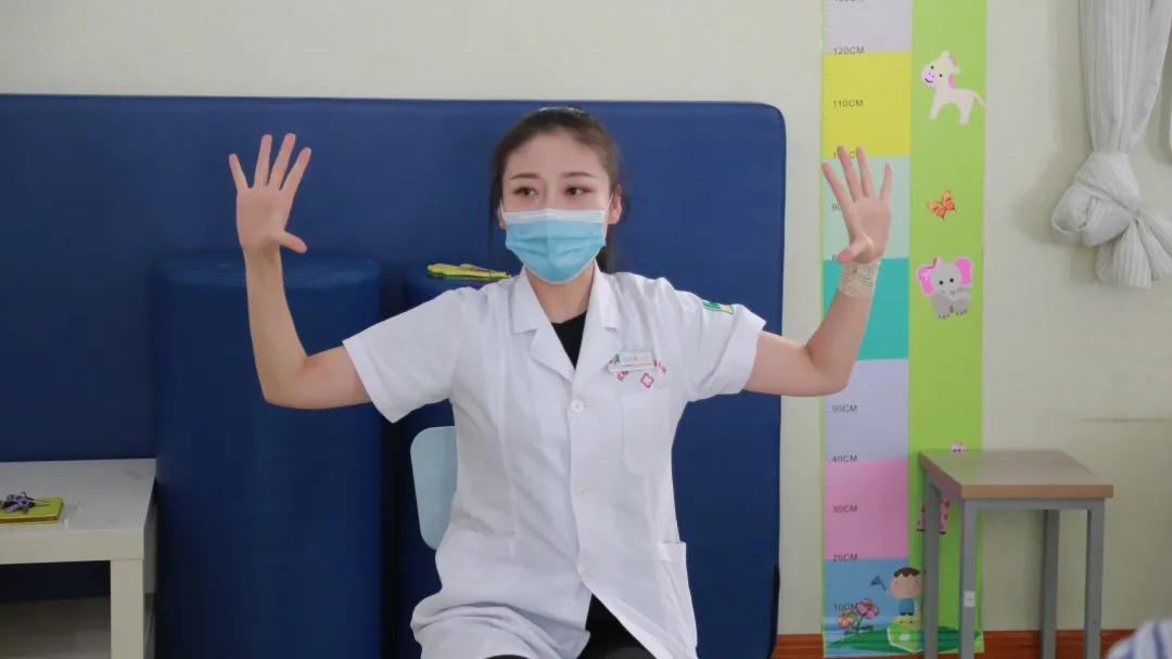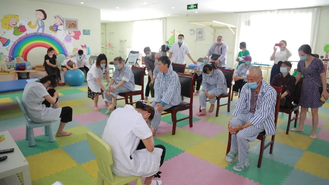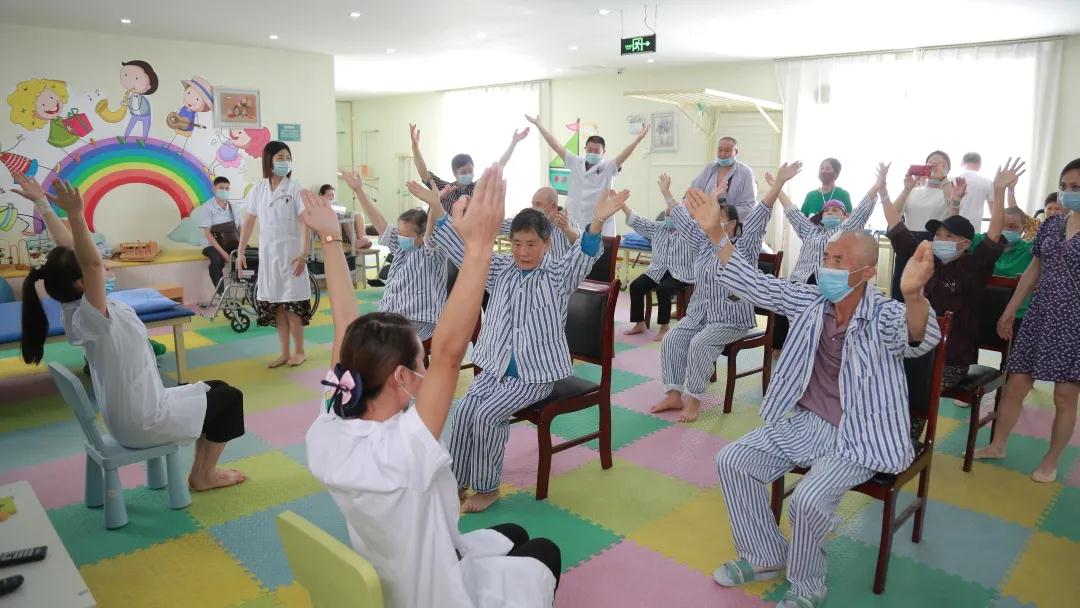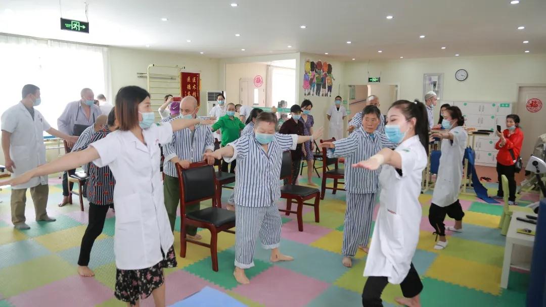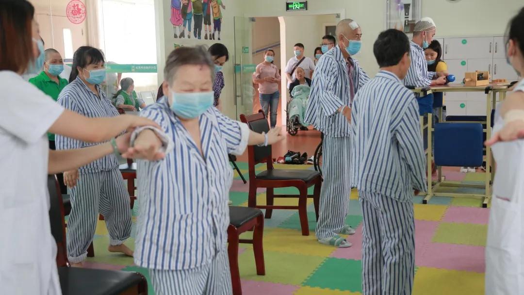 我院医护人员正在带领帕金森患者做康复操。