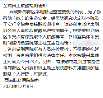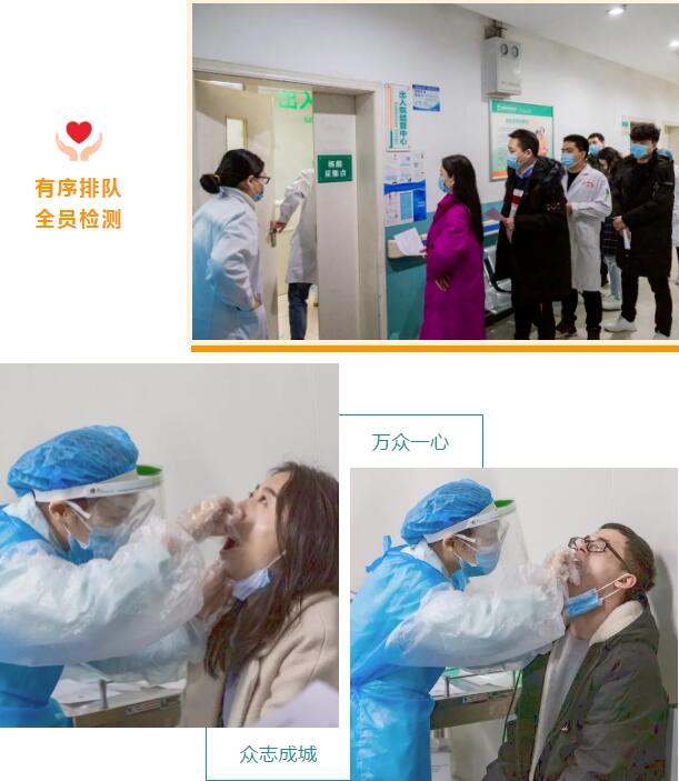 为了“敬佑生命、呵护健康”,我院将开启二次全院核酸检测。体检以科室为单位,门诊医生开单后持单到指定的地点集中做核酸标本采集,人人必查,应检尽检。严防严控,不给病毒留活路!