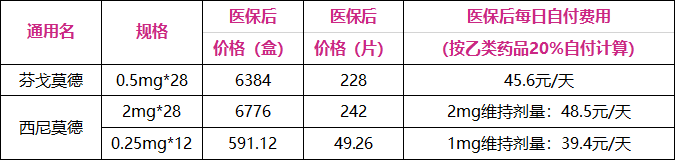 芬戈莫德、西尼莫德进入医保前后的价格对比