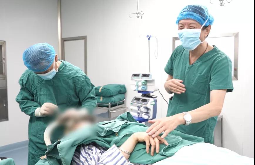 手术台上,这位帕金森患者刚开始还有点害怕,在赵全军教授及其他手术医生的安慰和指导下,配合医生做动作,慢慢的在手术台上就不抖了。