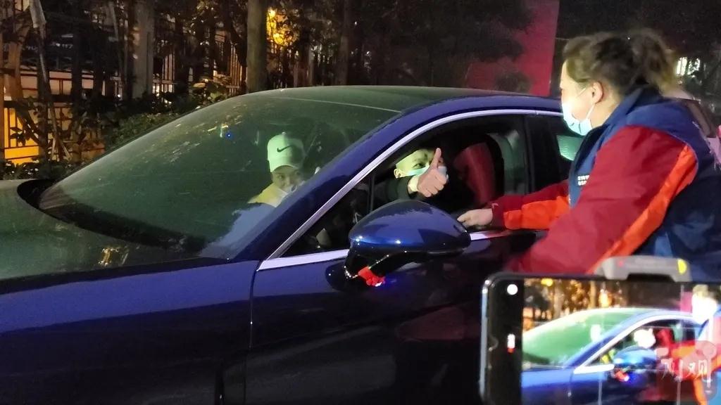 开车出门的小区居民向社区工作人员伸出点赞的大拇指