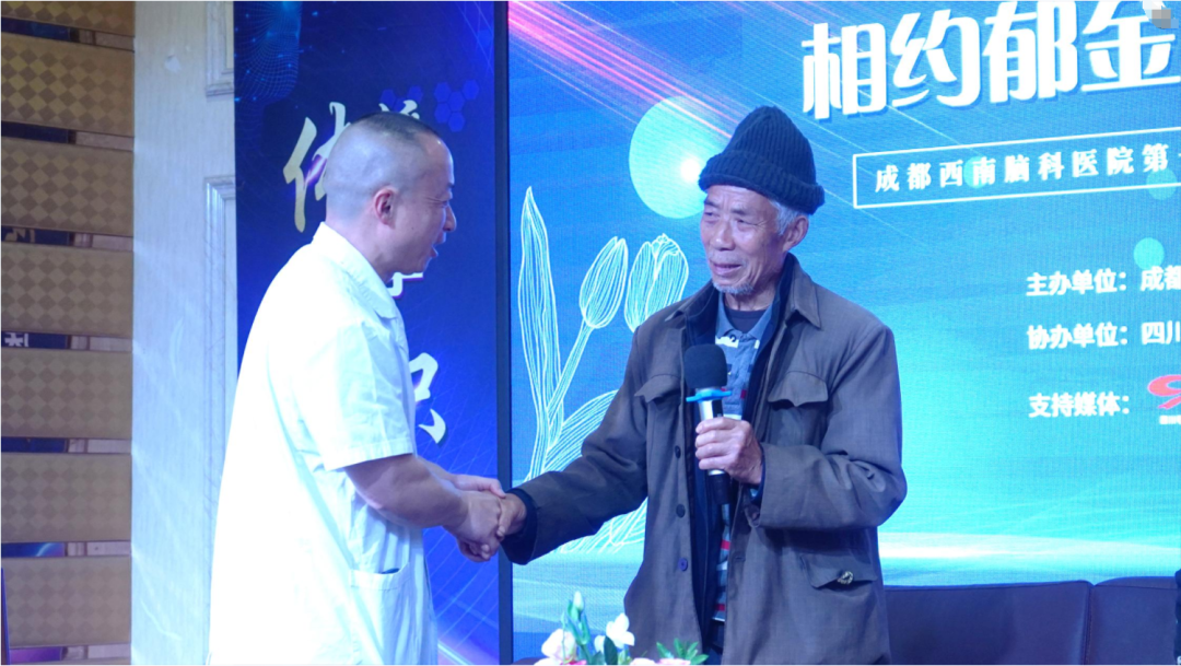 付大爷的故事让台下四川省人民医院神经外科的赵冬冬主任很是动容,上台与付大爷亲切握手,并送上了一束郁金香。随后,两位主任医生与付大爷老两口一起合影留念。