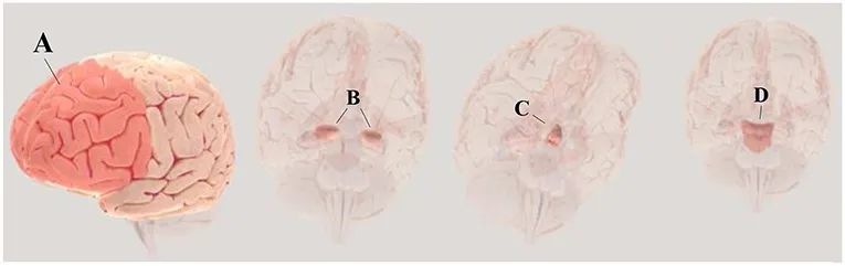 D是导水管周围灰质,是大脑内的一个区域,控制着我们对恐惧的反应。这时,你可能会躲在被窝里,或者从床上跳起来开灯。在这种情况下,你的行动能力要归功于你的导水管周围灰质的反应,它可以帮助你尽快逃离危险。
