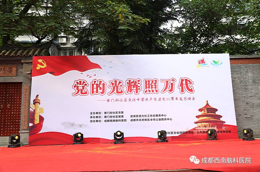 由成都市黉门街社区党委主办,黉门街社区居委会、武侯区培力社工综合服务中心承办,成都西南脑科医院、成都天府新区全鸣公益服务中心协办,主题为“党的光辉照万代”的庆祝中国共产党建党96周年文艺晚会在昨天顺利落下了帷幕。成都西南脑科医院的医生护士们也到场展开了“健康养脑公益义诊”活动,这是既成都市成龙街道、府南街道、抚琴街道、金沙街道、水井坊街道办之后,我院在本月开展的又一个社区义诊活动。