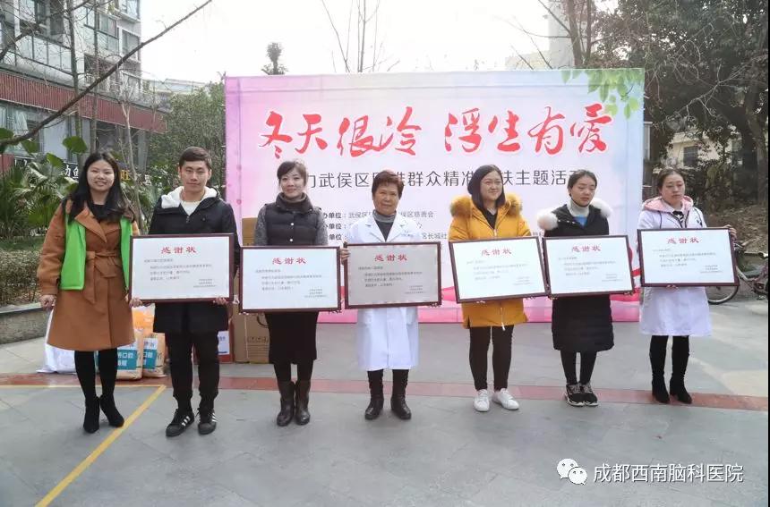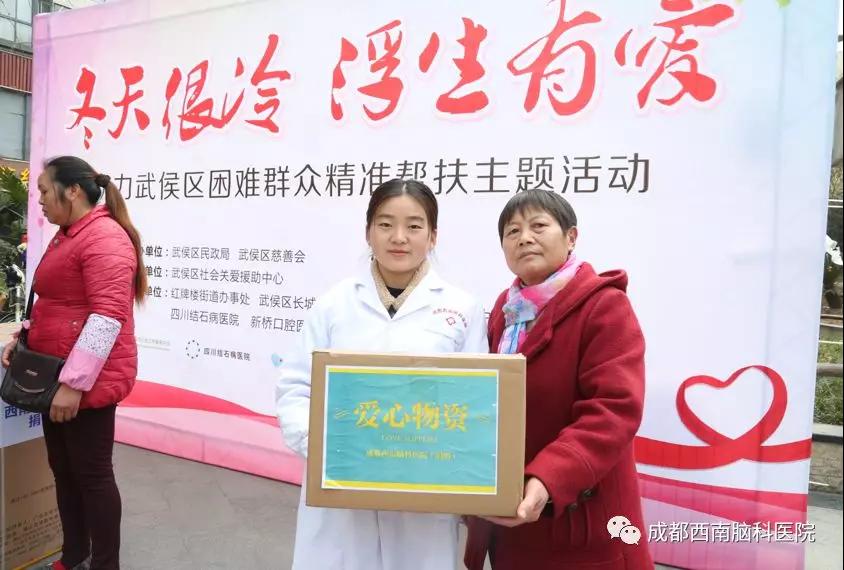 为了贯彻落实党的十九大精神,为了让更多的贫困居然感受到社会的温暖,由武侯区民政局、武侯区慈善会主办,武侯区社会关爱援助中心承办的“冬天很冷 浮生有爱”——助力武侯区困难群众精准帮扶主题活动在昨天下午圆满落幕。成都西南脑科医院作为支持单位也受邀参与了这次活动,在捐献爱心的同时还在现场开展了医疗志愿援助活动。
