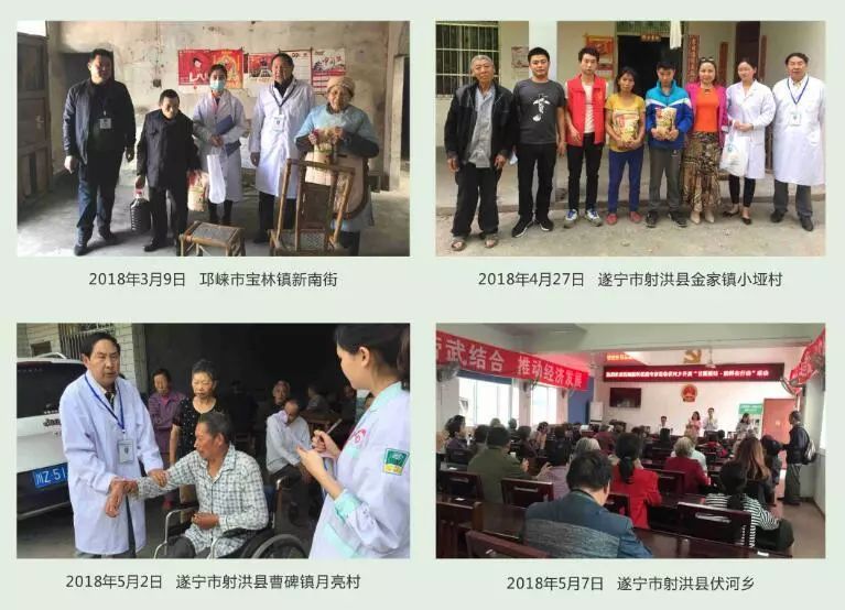 活动开始至今,我院的医疗志愿小队已经在四川省内各大城市乡镇陆续开展了医疗支援服务,主要内容有:残疾人健康宣传及预防、急救药箱发放及急救知识宣传、现场疾病健康知识普及咨询、现场康复指导、到户慰问贫困患者等。