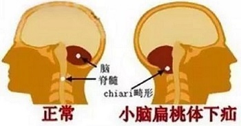 小脑扁桃体下疝畸形:名阿诺德-奇阿(Arnold–Chiari)畸形,为常见的先天性发育异常。是由于胚胎发育异常使小脑扁桃体下部下降至枕骨大孔以下、颈椎管内,严重者部分延髓下段、四脑室下部下蚓部也下疝入椎管内。常合并有脊髓空洞,也可引起脑脊液循环受阻导致脑积水。
