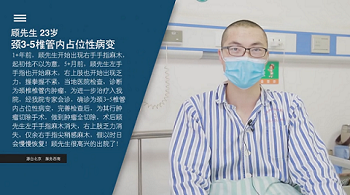 顾先生是一个23岁的大学生,正准备本科毕业考研究生,1年多前,顾先生开始出现右手手指麻木,起初他不以为意,5个多月前,顾先生左手手指也开始麻木,右上肢也开始出现乏力,握拳握不紧。在当地医院检查发现椎管内有一个肿瘤。