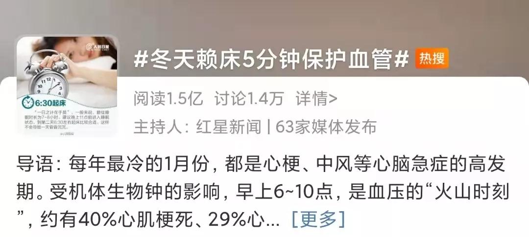 冬天尤其是每年较冷的1月份,都是心梗、中风等心脑急症的高发期。受机体生物钟的影响,早上6~10点,是血压的“火山时刻”,约有40%心肌梗死、29%心脏性猝死在此时发生。