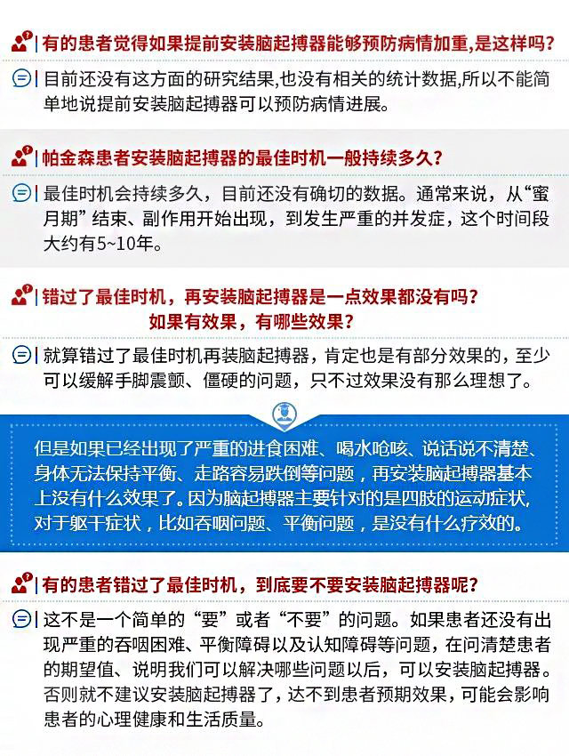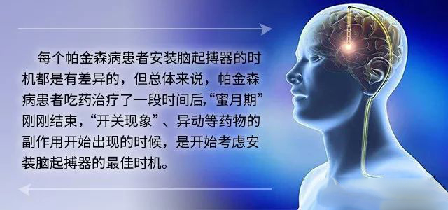 ②对于已经明确诊断是帕金森病的患者,可以安装脑起搏器。但是有身体条件的原因,比如头部有严重的真菌感染、有心血管系统疾病,或者有其他的严重合并症,就无法及时安装脑起搏器。