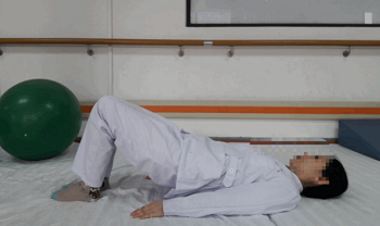 患者仰卧位,双腿屈曲,双足紧贴床面,为防止滑动,家属需扶住患者,慢慢抬起臀部,维持一段时间后慢慢放下等躯干训练。