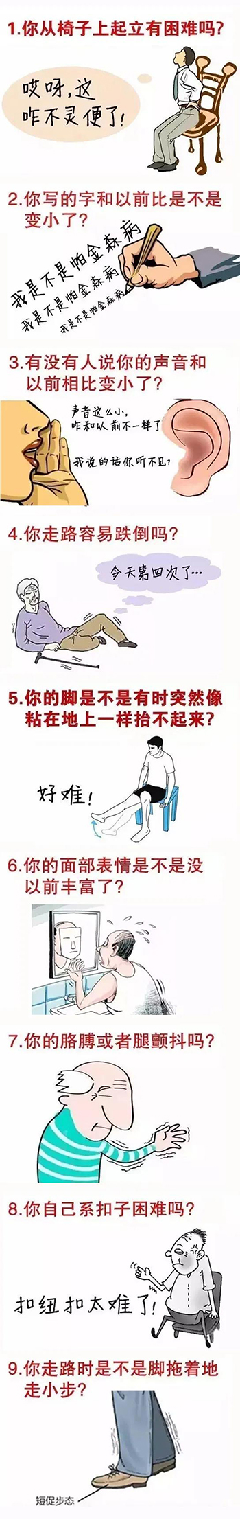 01、嗅觉减退、便秘,如果香蕉、泡菜、香料的味道都闻不出来了,并且原本正常的排便习惯也发生了变化,建议您及时去看医生。