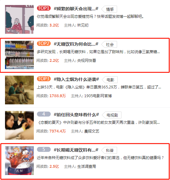 今日,两条关于无糖饮料的话题登上微博榜,引发热议。
