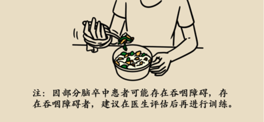 用勺子时,将勺子柄裹上一层毛巾以降低抓握难度,练习盛取食物,3至5次为1组,每次练习 1至2组;