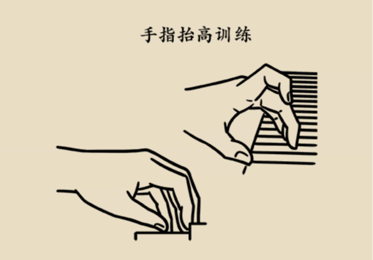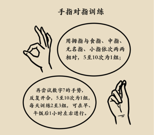 这是打字训练前的一个训练,手心朝下,将手自然放在桌子上,再依次抬高拇指、食指、中指、无名指、小指,循环5至10次一组,每天2组,可在早、午饭后1小时左右进行。