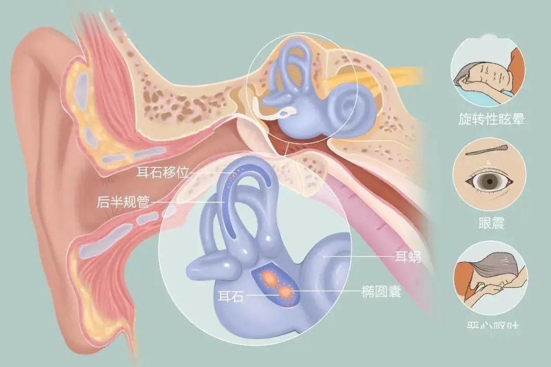 耳石脱落后与内耳其他平衡结构相互碰撞,诱发平衡失调,从而表现为天旋地转、眼震、恶心呕吐等。良性阵发性位置性眩晕(BPPV), 俗称耳石症, 是最常见的外周性前庭疾病。